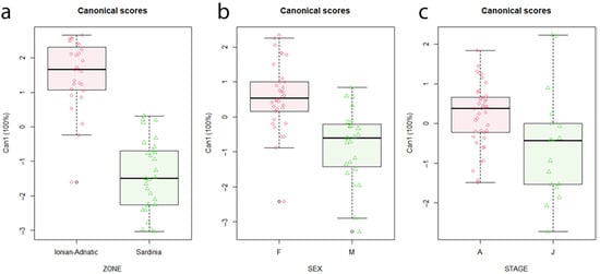 Canonical score results in the three assemblages tested: origin area (Zone: Ionian-Adriatic and Sardinia) (a), sexes (Sex: Female F and Male M) (b) and life stage (Stage: Adult A and Juveniles J) (c).