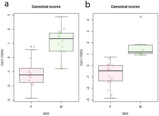 Canonical score results with selected MM in the sex assemblages (Female F and Male M) within the sampling area: Ionian-Adriatic (a); Sardinia (b).