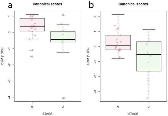 CDA confirms that the only assemblage that produced significantly different (p < 0.05) groups (Sardinia vs. Ionian-Adriatic) was the area (Figure 8a). While the assemblages by sex (male vs. female) (Figure 8b) and vital stage (juvenile vs. adult) (Figure 8c) did not produce significantly different groups (p > 0.05).