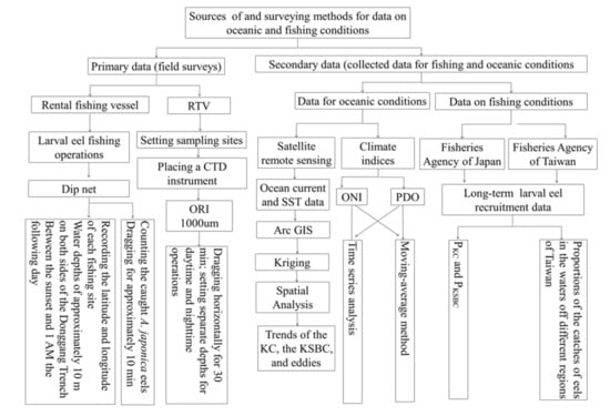 The Japanese eel Anguilla japonica is an important eel species for the marine fishery and aquaculture industries in East Asian countries and is currently the only eel species whose farming still relies on wild–caught larvae. Over the past three decades, environmental changes due to anthropogenic factors (e.g., deterioration and pollution of rivers and habitats, construction of reservoirs, and overfishing) coupled with climate change have led to a gradual depletion in larval eel stocks, which in turn has evoked a progressive decline in the offshore larval eel fishery industry. The catches of A. japonica began to decline for the first time in the 1970s [1]. Compared with the annual yield in the 1970s, the amount of A. japonica eels caught was 90% lower in 2016 [2]. Since 2010, the catches of A. japonica have declined by approximately 90% compared with the levels in 1960 [3,4]. However, intensifying climate change and accelerating decline in larval eel stocks may further increase the high volatility and uncertainty in catches of A. japonica from the fishing ground waters of Taiwan, which is where they migrate (including the Upstream Kuroshio and the South China sea (SCS)—Taiwan Strait (TS) region). In particular, these conditions may accelerate the decline in catches in the SCS–TS region, which is where the Kuroshio Branch Current (KSBC) intrudes [4].