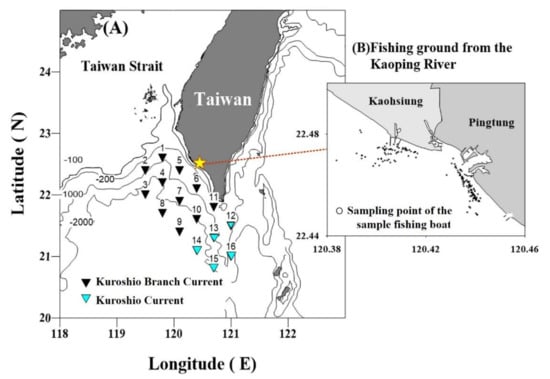 Locations of the shipborne sampling sites and sampling sites in the traditional fishing ground waters of Gaoping in southwestern Taiwan. (A) Locations of the shipborne sampling sites. (B) Sampling sites in the fishing sites of A. Japonica.
