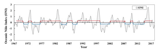 Trend in the ONI from 1967 to 2019. The data were obtained from NOAA, accessed on 25 May 2021 (http://origin.cpc.ncep.noaa.gov/products/analyses_monitoring/ensostuff/ONI_v5.php). The red dotted line is the El Niño period, and the blue dotted line is La Niña.