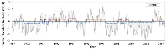 Trend in the PDO from 1967 to 2019. The data were obtained from NOAA, accessed on 25 May 2021 (http://www.esrl.noaa.gov/psd/data/climateindices/list/). The red dotted line is the warm water period, and the blue dotted line is the cold water period in the West Pacific.