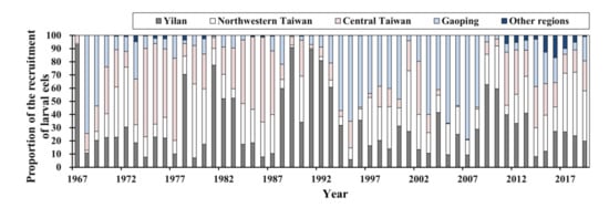 Trends in the recruitment proportions of larval eels in the waters of different regions of Taiwan from 1967 to 2019. The data were obtained from the AFSRT, accessed on 25 October 2020.