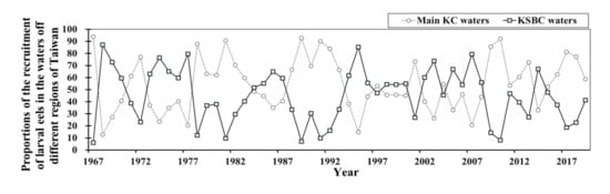 The recruitment proportions in the waters of eastern, northeastern, central, and southern Taiwan and its offshore islands fluctuated considerably on an interannual scale from 1968 to 2019 (Figure 6). After dividing the A. japonica catch into PKC and PKSBC based on the fishing ground formation mechanism, we found that the catch proportion changed every year, and there was a phenomenon of regime change between PKC and PKSBC (Figure 7). In particular, PKSBC exceeded 50% in many years (i.e., 1968–1970, 1973–1974, 1986–1987, 1994–1996, 2002–2004, 2007–2008, and 2014) and even 70% in some years (e.g., 1995, 2003, 2008, and 2014) (please refer to Supplementary Materials). Analyses of the changes in PKC and PKSBC also revealed that waters with PKSBC > 70% were the primary supply source of A. japonica in each corresponding year.