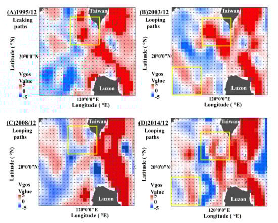 In addition, the KC intrusion type may vary with time even during the same winter. Caruso et al. [17] found that the KC took a type 3–A looping path into the SCS in 1997, 1998, 1999, 2000, and 2003–2005; the type 3–A path turned into a type 3–B path in 1997, 1998, 1999, and 2003–2005; and the occurrence of a looping path was accompanied by the formation of an anticyclonic warm–core eddy in the open sea of Kaohsiung and a cyclonic cold eddy in the SCS. These findings are similar to the in situ data analyses in our study. Both the intensity and direction of the KSBC suggest that the KC intruded into the SCS along a looping path in December 2003, 2008, and 2014 (Figure 8B,D).