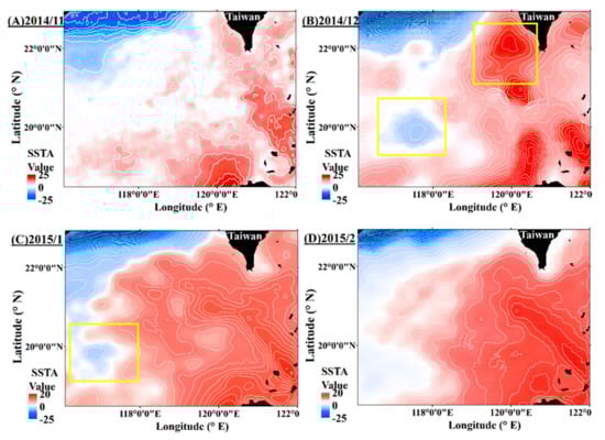 Spatial distribution of the positive and negative SSTAs in the waters of southwestern Taiwan in the fall and winter of 2014–2015 (p < 0.05). (A) November 2014. (B) December 2014. (C) January 2015. (D) February 2015. The data were obtained from MODIS onboard the Aqua satellite. The yellow block in the figure is geographical location by the warm core eddy in the SCS–TS region.