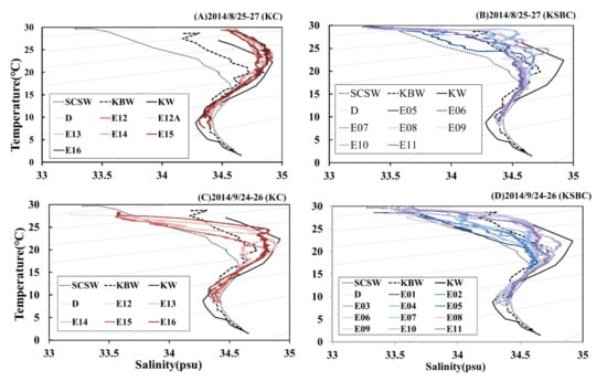 Changes in the ship–borne measurements of the surface temperature and salinity of the main KC and KSBC waters of southwestern Taiwan in 2014. (A) 25–27 August 2014 (KC). (B) 25–27 August 2014 (KSBC). (C) 24–26 September 2014 (KC). (D) 24–26 September 2014 (KSBC).