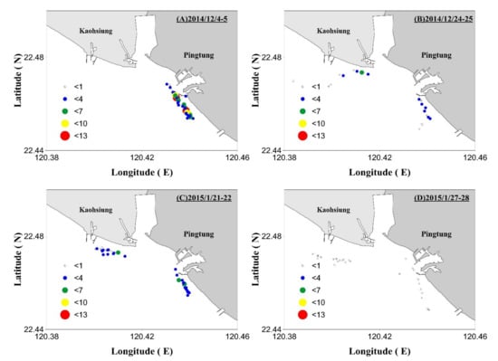 The A. japonica fishing surveys in the winter of 2014–2015 yielded the following findings. Between November 2014 and February 2015, the distribution of the fishing sites and recruitment in the traditional fishing grounds of Gaoping shifted from south to north and gradually dispersed (Figure 11). In November 2014, even though observations confirmed that the high–temperature water of the KC had passed through the LS and that the KC intruded into the SCS, no A. japonica were caught during our fishing survey (Figure 9A and Figure 11A). In December 2014, A. japonica began to be caught in the traditional fishing grounds of Gaoping, which were located primarily in the open sea of Pingtung. Recruitment was relatively densely distributed (Figure 11B). In January 2015, the fishing sites in the fishing grounds began to spread out, which was accompanied by a decrease in recruitment (Figure 11C). In February 2015, no A. japonica leptocephali were caught on our fishing survey (Figure 11D). Instead, A. japonica leptocephali began to be caught in the fishing grounds in the waters of northern Taiwan, where the main KC passed [2].