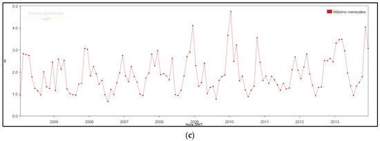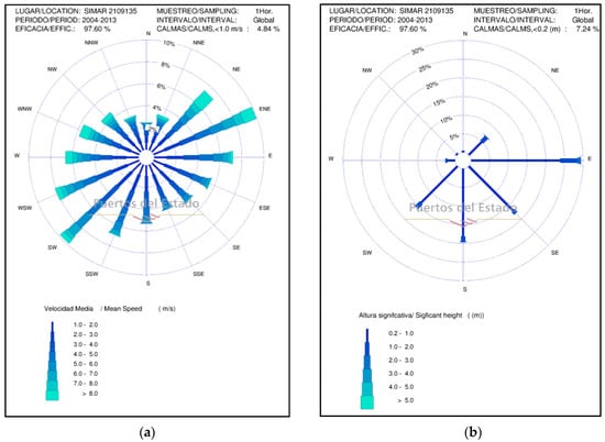 The characterization of the dynamic agents (wind and waves) of the study area has been carried out using data from the official web “Puertos del Estado” of the Ministry of Transport, Mobility and Urban Agenda of the Government of Spain (http://www.puertos.es/es-es/oceanografia/). The wind system in the area is dominated by the dipole ENE (10%)-NE (7.5%) and SW (9%)-WSW (8%) directions (Figure 2a). The modal wind speed is between 2–3 m·s−1 (7.2–10.8 km·h−1), the maximum values exceed 22 m·s−1 (79.2 km·h−1) and centered its presence during December and January. Waves (Figure 2b) are characterized by a significant height (Hs) of less than 0.5 m (51%) and a period of between 4–5 s. The predominant directions are from SW (16%) and E (15%), and only 4% of the waves exceed 1.5 m, the predominant storms being in E-ENE direction. The activity of the storms has been controlled based on the maximum Hs time series, between the periods 2004–2013 (Figure 2c). From the series, it is extracted that in the decade studied, there have been 39 storms greater than 2.0 m of Hs, wave height that is considered a storm on the coast of the Llobregat delta [32,33], 14 with a height greater than 3.0 m, 5 greater than 3.5 m, and 3 greater than 4.0 m. These storms cause a run-up [34] of between 0.6–1.5 m for Hs > 2.5 m and a rise of 1.0–2.4 m in storms of Hs > 4.0 m. Such run-up heights are capable of producing complete erosion of the embryonic dunes and producing erosion scarps and washover deposits in the primary dune.