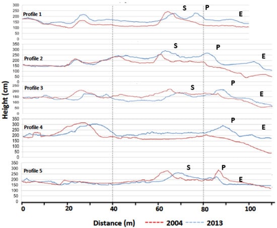 Topographic comparison of the five topographic profiles (see the location in Figure 1), between 2004 and 2013. Distance is measured from the landside limit of the dune system to the bare beach. Three to five dune ridges are observed in each, the most active being the secondary dune (S) at ca. 65 m., the primary dune (P) at 75 m, and the embryonic dune (E) at 90 m. Both the primary dune (P) and the embryonic dune (E) have originated during these almost 10 years of regeneration measures.
