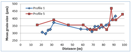 The grain-size distribution of the dune system, of all 29 samples from profiles 1 and 5, shows an average of 353 (±42) μm, while the beach has an average value higher than 400 μm (Figure 4), the range of grain sizes of all samples fall within the class of medium sand of Wentworth [43]. Being the mode, a little higher, standing at 360.09 (±36.52) μm. Both the mean and the mode have low variation coefficients between 12% and 10%, respectively. Sediments show a decrease in their mean diameter from sea to land, which can be interpreted as the majority of the sediment being supplied to the dune system from the dry beach area.