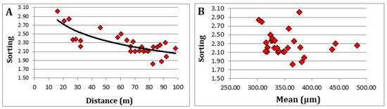 The sorting presents an average value of 2.29 (±0.27), with a coefficient of variation of 11.97%. Sediments were better sorted (lower values) when they were closer to the active areas of the embryonic dune or on the dry beach (Figure 5A), as indicated by the decrease in values from land to beach. The mean size and the sorting (Figure 5B) show a lack of relationship. The sediments were better sorted (lower values) when they were closer to the active areas of the embryonic dune or on the dry beach (Figure 5A), as indicated by the decrease in values from the landside to the beach.
