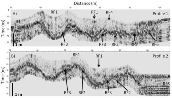 We have focused on the internal structure of the most active part of the dune system, shown in Figure 6, as the GPR radargrams performed in profiles 1 and 2 (see Figure 1 for location). In profile 1 (Figure 6A), the most marine area (from 90 to 100 m), RF 5 and 6, would indicate the occurrence of beach deposits (low-angle sea-ward dipping reflectors) and beach-bars (short seaward dipping), respectively. Meanwhile, towards the landside, the embryonic dune formation process is observed (between 84 and 90 m), where the discontinuous reflector clinoforms with seawards dips (RF2) would indicate the sediment accretion process that occurs in the seaward of the dune. These reflectors are eroded in their upper part, by washover processes during storms, which are deposited as RF3 (dipping reflectors with dips towards the landward), filling the interdune depression. The accretion processes on the seaward side (RF2) and the deposition of sediments on the landward side (RF3) are observed to be repeated on both the primary dune (70 m) and the secondary dune (60 m).