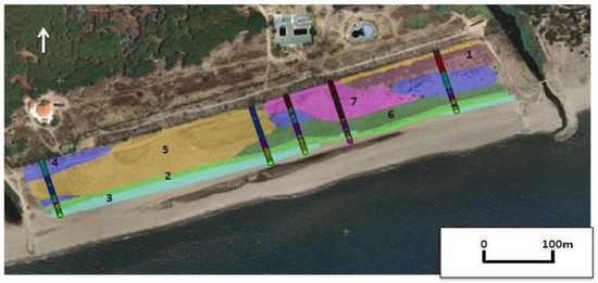 The GPR profiles have been worked according to the methodology of Bistrow et al. [38]. This methodology differentiates a series of radar facies and associates them with certain sedimentary processes (Figure 6). In our profiles, we have differentiated six radar facies (RF), which we describe as: RF1 (discontinuous lower amplitude curved concave-up) indicating reworking processes and/or filling of furrows; RF2 (discontinuous, low-angle clinoforms at the stoss side of the dune, with seawards dips) interpreted as sedimentary accretion on the seaside; RF3 (discontinuous subhorizontal, gently dipping reflectors at the lee face of the dune with dips towards the landward) interpreted as roll-over of aeolian deposits formed by sand eroded from dune crest or from storm washover deposits; RF4 (low amplitude, discontinuous concave and convex-up undulating), due to sedimentary accumulation with vegetation; RF5 (continuous low-angle clinoform sea-ward dipping) interpreted as beach deposits; RF6 (short landward/seaward dipping) interpreted as beach bars.