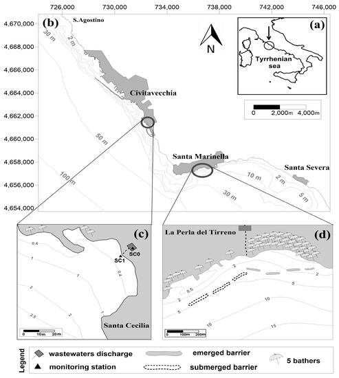 Along the Tyrrhenian coast near Civitavecchia, Latium (Figure 1a,b), the increase of population density during summer season determines a significant increment of the volume of wastewaters that are discharged directly into the sea, without undergoing any preliminary depuration treatment. In this coastal zone two bathing areas, “Santa Cecilia” in Civitavecchia and “La Perla del Tirreno” in Santa Marinella, were chosen as study sites.