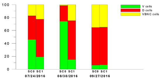 Percentage contribution to total E. coli population of viable (V), dead (D) and viable but not culturable (VBNC) fractions observed at the wastewater discharge (SC0) and monitoring (SC1) sites in Santa Cecilia during summer 2016.
