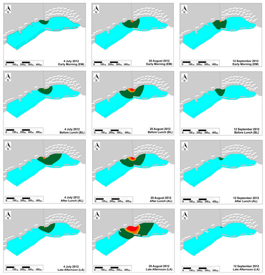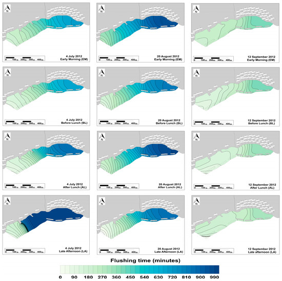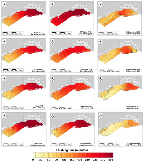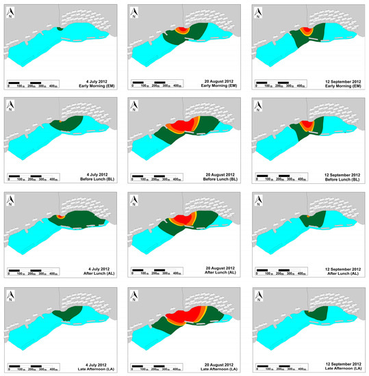 The residence time of V E. coli ranges from values close to 0 min in the western part of the study area to 300 min in the eastern zone, where bathers are present in high numbers (Figure 5). In particular, the highest FT values, with consequent longest water renewal, are observed throughout all the day on 4 July and at the earlier (EM) and latest (LA) daytime samplings on 20 August. On the other hand, shorter renewal times are calculated on 12 September, when FT values are approximately half (180 min) of those recorded in the two other samplings.