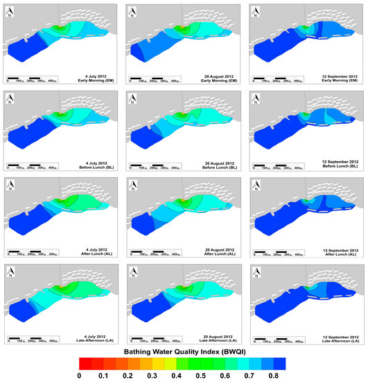 In this survey, low BWQ Index values are found in correspondence of the discharge point and in the western part of the bathing area, where the presence of emerged barriers limits the water exchange with the off-shore area. In the western part of bathing zone, the lowest BWQI values are observed during late afternoon on 4 July, while the highest ones on 12 September, indicating a good bathing water quality (Figure 7).