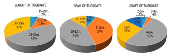 Following the statistical analysis of tugboats in the Baltic seaport region, 217 tugboats were identified. The analysis included the Stockholm, Rostock, Klaipėda, Kiel, Gdansk, Venspils, Turku, Riga, and Hamina seaports, and other ports in the Baltic Sea region. Figure 1 presents the distribution of the tugboats according to their length, beam, and draft of the hull.
