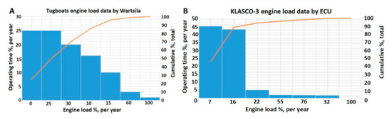 At first glance, the difference between the load diagrams (which are based on a Pareto diagram) of tugboats is determined by two main factors: the principle of forming diagrams—the arrangement of load classes in ascending/descending order of relative time and the different values of comparative load classes of statistical and real data of KLASCO-3 tugboat (e.g., according Wartsila load data: 0%, 10%, 15%, 25%, 30% and actual KLASCO-3 load data: 7%, 16%, 22%, 32%, etc.). The real difference is minimized if the load classes (rather than the relative time classes) are arranged in descending/ascending order with the calculated time intervals. According to statistics, the working time of the tugboats from 0% to 10% load is 41%, and the KLASCO-3 tugboat (up to 7% of the load) is 45%. Loads up to 30% according to statistics was 96%, and for KLASCO-3 (up to 32% of load) was 94%. According to statistics, up to 60% of the load is 98% and load of KLASCO-3 96%, respectively. The time of operation of tugboats at rated power does not exceed 1%. According to the statistical and actual seaport tugboat engine load data, it is observed that the main loads are in the range from idle mode to 30% engine load. The difference between the static tugboat engine load factor (18%) and the load factor of the KLASCO-3 tugboat (14.5%) is acceptable. It is acceptable to assume the correspondence between the statistical and the actual engine load data of the seaport tugboat KLASCO-3.