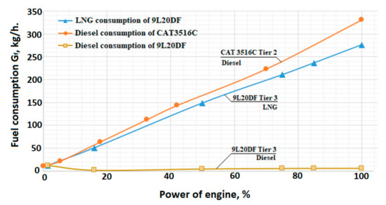 The energy efficiency of new dual-fuel engines from market-leading companies (Wärtsilä, MAN Diesel & Turbo, Caterpillar, etc.) is not inferior to the efficiency of diesel-powered engines and reduced harmful emissions [8,9,10], which meets the requirements of environmental standards without the use of expensive secondary technologies [11,12,13,14].