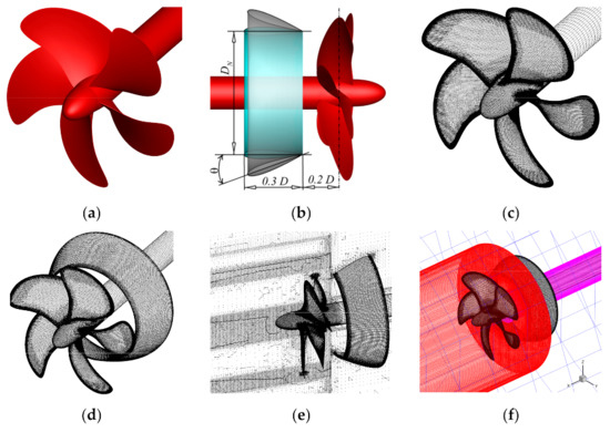 Geometries and computational meshes. (a) KP505 propeller geometry, (b) computational set-up for the nozzle-propeller computation, (c) single propeller working in open water, (d) surface mesh for the nozzle-propeller computational case, (e) computational mesh in the symmetry plane, (f) sliding grids for the nozzle-propeller computation.