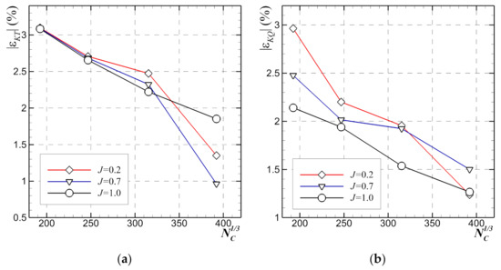 For the given computational domain size, four different grids were generated for the POW grid convergence test. Let them be denoted by G1–G4. G1 consists of 7.12 × 106 cells, G2 of 15.01 × 106 cells, whereas G3 and G4 consist of 31.32 × 106 and 60.3 × 106 cells, respectively. The test is performed for a set of three advance coefficients, namely J = 0.2, J = 0.7 and J = 1.0. The grid convergence test was carried out in terms of the computed thrust and torque coefficients compared with the experimental data reported in References [25,26], as Table 2 shows. The figures tabulated in Table 2 show a monotonic decrease of the computational error for both thrust and torque coefficients with the increase of the resolution of the discretization. The same conclusion may be drawn from Figure 2, which depicts the evolution of the relative error with the d-th root order of the number of cells, Nc, of the four grids considered. Here, d stands for the dimensionality of the flow problem.