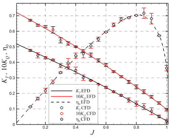 POW computations were performed based on a rotating frame technique for a series of 19 advance coefficients, i.e.,. As mentioned above, all the simulations were performed at the same rotational velocity of 10 rps, so the different advance coefficients were obtained by modifying the incoming axial velocity. A comparison between the experimental data provided in Reference [26] and the corresponding numerical solution is tabulated in Table 6 and depicted in Figure 3, where the experimental data are drawn with lines and the computed solutions by symbols. The errors are shown by bars whose lengths are drawn proportionally to , which is computed in Table 6.