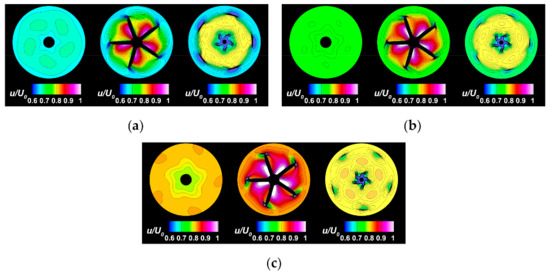 Instantaneous non-dimensional axial velocity fields computed at 0.5R upstream of the propeller (left), in the propeller plane (middle) and at 0.5R downstream of the propeller (right): (a) , (b) , (c) .