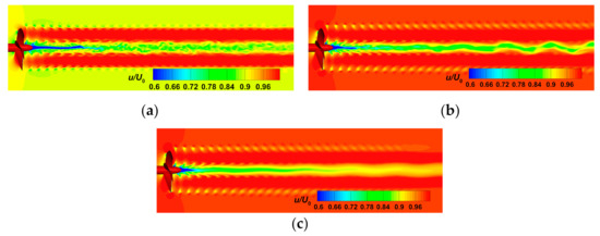 Obviously, the same conclusion may be drawn from the instantaneous non-dimensional streamwise velocity contours drawn in the longitudinal vertical plane of the propeller depicted in Figure 5. Tip vortex locations are clearly marked by lower axial velocity, whose values are lower in the near-wake of the blades, as expected. The gradients of the axial velocity in the cores of vortices get smaller downstream in the wake because of the viscous dissipation. Apart from that, a rope-like swirl vortex is released by the hub and propagates in the downstream of the propeller. Its intensity is decreasing with the increase of the advance ratio, thus confirming the theory. The periodicity of the tip vortices is almost constant, a fact which suggests that the numerical dissipation induced by the solver is small enough.