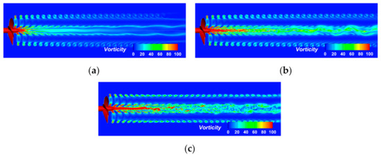 Directly related to the instantaneous velocity is the instantaneous vorticity shown in Figure 6, since the latter is defined as twice that of the rotation vector, i.e., the curl of the velocity vector. Strong tip-released structures are shed in the wake, correlating with local maxima of turbulent kinetic energy. The good agreement between the velocity and vorticity is explainable since they derive one from the other. This can be seen in Figure 6, which depicts the instantaneous vorticity contours computed for the same advance coefficients as in the non-dimensional axial velocity representation. The figure shows that regardless of the J value, the near-field is dominated by well-defined coherent tip and root vortices. They manifest as spirals of a regular shape released by each blade. The author believes that this is the merit of the proper mesh clustering of the wake in those regions, as shown in Figure 1e.