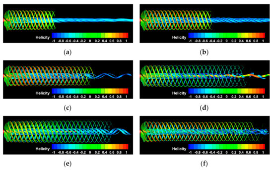 Vortices released by the KP505 propeller working in open water computed as iso-surfaces of . (a), (b), (c), (d), (e), (f).