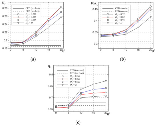 The figure shows the variation of the three parameters with the diameter and the inclination angle of the duct. For comparison reasons, the computed and measured values of the force coefficients that correspond to the no-duct propeller case are also drawn. Regardless of the nozzle diameter,, the values of , and show the same tendency of increasing patterns with respect to the attack angle , except for the efficiency that corresponds to the and cases, in which losses of less than 2% were observed. Force and moment coefficients corresponding to the propeller-nozzle case are larger than the corresponding values for the propeller without the duct, except the efficiency computed for the above-mentioned two attack angle cases. The present findings resemble those of Go et al. [23], who performed a similar investigation, but for a higher axial velocity.