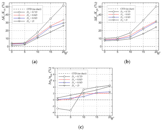 The most significant increase of the thrust and torque coefficients corresponds to the smaller duct diameters, except for the efficiency computed for the two lower values of the attack angle, as mentioned above. In the considered range of , the differences in magnitudes of corresponding coefficients are rather small for a fixed value of . However, as increases, the magnitude of the coefficient increase becomes smaller, as Figure 10 shows.