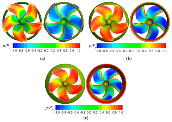 Figure 11 depicts a comparison of the pressure distributions on the nozzle and the propeller suction and pressure sides, respectively. The flow solution is computed in this case for nozzles with inclined at , and , respectively. Comparing the solutions drawn in Figure 11 to that shown in Figure 8 for the single propeller case, one may notice the wider area of lower pressure on the suction side than in the case without the duct. Besides, the non-dimensional positive pressure covers a much wider area on the pressure side, but with a rather different distribution on the blade surface. Obviously, the lower and higher pressures on the suction and pressure sides are ultimately responsible for the larger thrust and torque than in the case without a nozzle. Another important issue is related to the tip areas of the pressure sides of the blades, where the pressure does not reach the maximum value, which could be clearly seen in Figure 8. That is seemingly due to the nozzle, which is exerting a significant influence on the flow in the propeller plane. A sharp gradient of pressure is found around the leading edge between the relative radius of 0.4 and 0.9 as a result of the sharp velocity gradient related to the interface of the axial velocity layers.