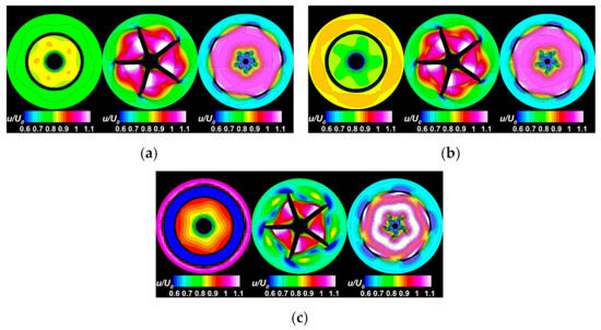 Figure 12 proposes a comparison of the instantaneous non-dimensional axial velocity fields computed for at 0.5R upstream of the propeller (left), in the propeller plane (middle) and at 0.5R downstream of the propeller (right) for , and , respectively. The suction effect induced by the propeller affects the upstream flow, thus regions of axial velocity gradients distribute almost uniformly along the circumferential direction, rotated at angles that correspond to the positions of the blades. The acceleration induced by the duct contributes to an increase of the axial velocity in the slipstream compared to the case without the duct shown in Figure 4b. As a consequence, the theoretical border between the slipstream and freestream becomes more perceptible in the wake of the propeller, regardless of the attack angle of the nozzle. Velocity contours formed by the root-side vortices behind the propeller, which were rather prominent in the case without the duct, are slightly swept by the duct-induced faster flow and are loose in intensity. As increases, significant gradients are found inside both inner and outer corresponding areas of the nozzle, as comparatively shown in Figure 12b,c.