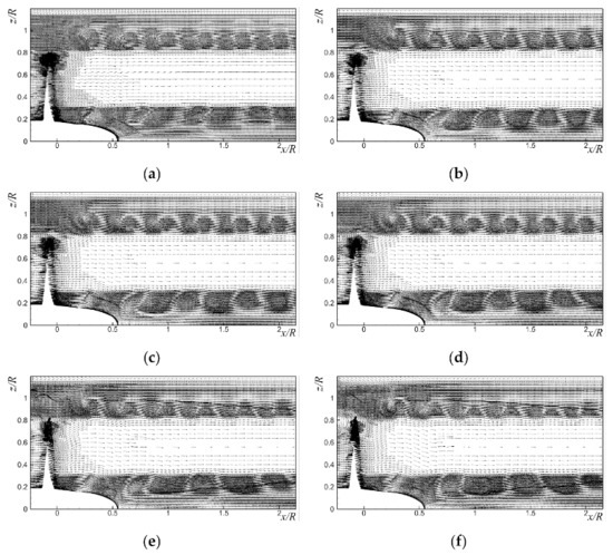 This behavior is even more prominent when the duct diameter is smaller, as shown in Figure 14, which shows the instantaneous velocity vector fields in the propeller wake computed at an advance coefficient of for . As described above, the decrease of the nozzle diameter induces modifications of the streamwise velocity distribution not only in the propeller plane, but also in its wake.