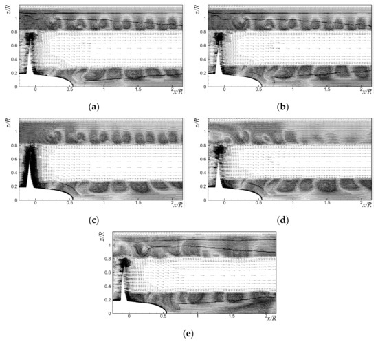 Instantaneous velocity vector fields in the propeller wake computed at for (a), (b), (c), (d), (e).