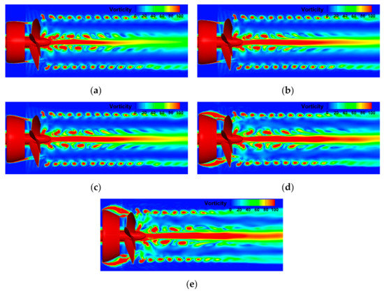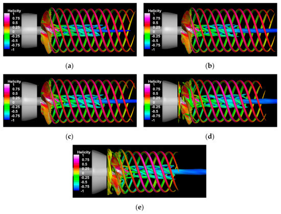 Vortices released by the nozzle-propeller ensemble working in open water, computed as iso-surfaces of . (a) , (b) , (c), (d) , (e) .
