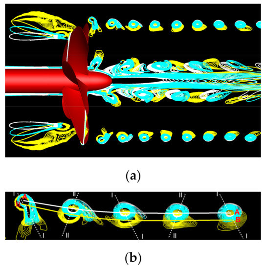 In the following, a comparative analysis of the topology of the vortices released by the open water KP505 propeller is proposed in Figure 7, where six different computed advance ratios varying from 0.1 to 1.0 are considered. The geometries of the vortices were defined based on the criterion.