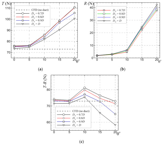 The net thrust realized by the propeller has to be analyzed in conjunction with the drag forces exerted by the duct, shaft, hub and blades since they are parts of the flow equation. Based on numerical solutions not reported here, the shaft and hub drags are not significantly dependent on the duct size and its attack angle. Consequently, only the thrust exerted by the blades and the drag of the duct are drawn in Figure 20a,b, respectively. Figure 20a provides the propeller thrust computed for the five attack angles of the nozzle. For reasons related to an accurate quantitative estimation of the duct contribution, the thrust computed for the single propeller denoted by was found as well. As expected, the drag of the nozzle, denoted by in Figure 20b, increases proportionally with the attack angle regardless of the duct size. Obviously, this is due to the violent flow separation that has been shown in Figure 18a. On the other hand, for a certain angle of attack, the magnitude of the duct drag increases as the nozzle diameter increases, as also shown in Figure 20b.