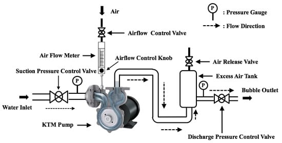 The system that we tested was a microbubble pump, Karyu Turbo Mixer (KTM) pump, developed by Nikuni Co., Ltd. in Kawasaki, Kanagawa, Japan, (see Figure 1). The centrifugal pump uses a principle similar to the dissolved air flotation method []. However, the air dissolution and mixing occur simultaneously as the air and water are drawn in and pressurized by the mechanics of the uniquely designed turbine impeller. A combination of frictional, axial, and centrifugal forces created by the impeller helps enhance entrainment of air by breaking the air into small bubbles and generating high operating pressure []. Atmospheric air is drawn into the low-pressure suction side of the pump eliminating the need of an air compressor. A large mixing tank is also not required leading to a more compact system that is suitable to be used at sea if needed. The average size of the microbubbles produced by this system is 25 µm but a dimeter of less than 10 µm can be obtained by varying operating conditions including air and water flowrates and pressure [].