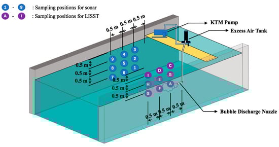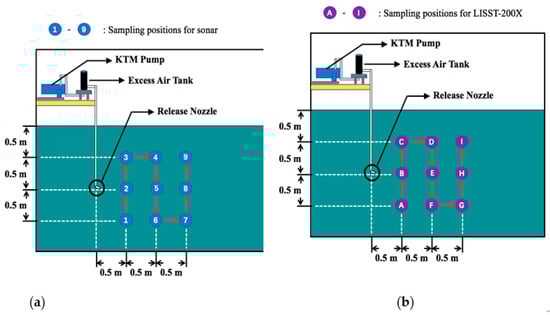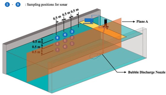 In the experiment, the LISST-200X sensor was set up in front of the release nozzle; the bubble cloud passed through the sensing range of the LISST-200X (see Figure 6). The Ping360 sonar was placed to one side of the release nozzle, with its horizontal scanning direction covering the passing plume. Nine sets of sampling positions were selected to precisely measure the distribution and motion of the bubbles (see Table 2 and Figure 7). The horizontal and vertical distances between adjacent sampling positions were selected to be 0.5 m to cover the length and height of the plume based on visual observation. In our experiment, the water in the tank remained static except for the disturbance from the water and bubbles coming from the discharge nozzle.
