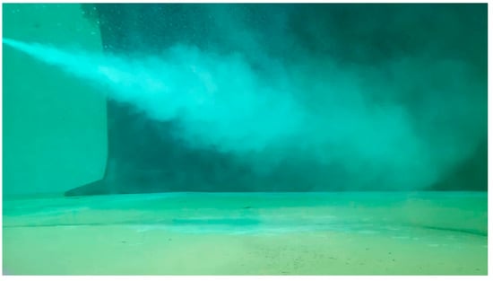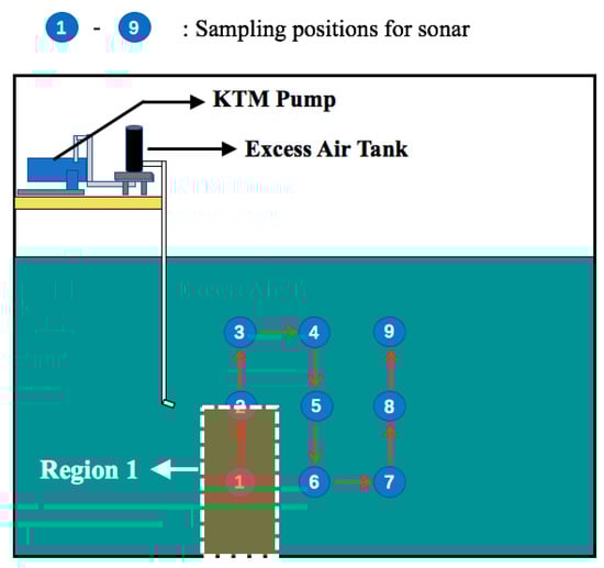 The sequence of the tests is indicated by the red arrows shown in Figure 8. When the sonar and the LISST were set in their positions, these two sensors were started up to collect background information for one minute. This background information was a reference for calculating the residence time of bubbles. Then, the bubble generator was turned on to generate bubbles for more than 3 min in order to get stable a plume. The bubble generator was then stopped and the sonar and the LISST continued their measurements until there was no clear plume visible in the sonar image. The amount of time after pump was shut off until the plume disappeared from the sonar image was approximated as the residence time of the bubbles in the water at the specified depth. The bubble plume generated by the KTM pump can be seen in Figure 9.