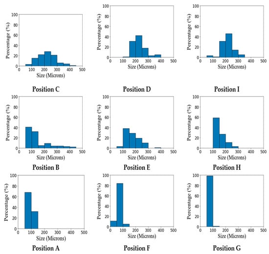 The size distributions of the bubbles collected by the LISST-200X sensor at the 9 sampling positions when the bubble generator was working are shown in Figure 10. This can help understand size distribution of the bubbles at different locations within the plume. The sampling position C, D, and I were at a higher altitude than the release nozzle, the sampling position B, E, and H were at the same depth as the release nozzle, and the sampling position A, F, and G were lower than the release nozzle. From the bubble size distribution, it can be observed that: