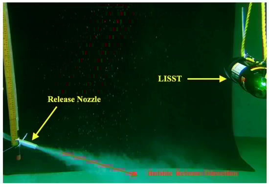 The variation of bubble sizes in the horizontal direction was partly impacted by the different rise velocities of the bubbles where larger bubbles, having higher rise speeds velocities, surfaced quickly without travelling a long distance horizontally. In addition, in the experiment, the release nozzle released the bubbles at an angle of inclination of 20° (see Figure 11), which defined the path of the plume and made bubbles, especially smaller bubbles as they tend to travel horizontally rather than upwards, go to deeper water as they moved further away from the nozzle.