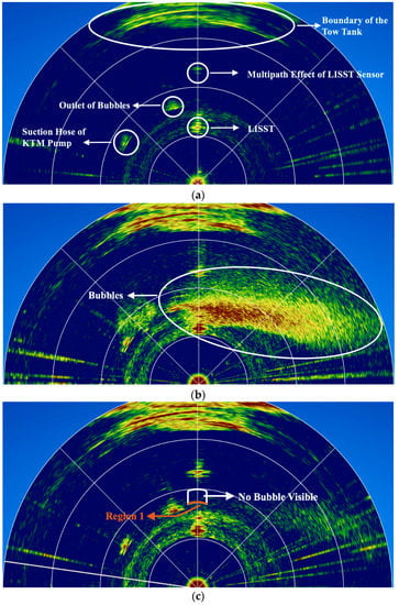 The sonar images collected from position 3 before the start of the bubble generator, when the bubble generator was working, and when there was no plume on the vertical plane for calculating residence time are presented in Figure 14. In Figure 14c, there were no visible bubbles in the sonar image in region 1 and above, which was regarded as the disappearance of bubbles.