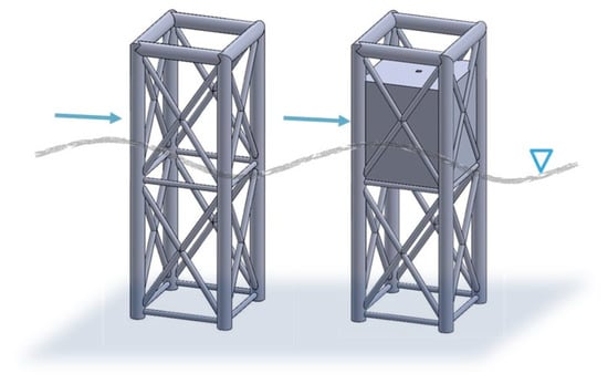 As published lately [], an OWC wave energy converting system integrated with the column of a jacket platform was studied. In that study the OWC was installed in one of the legs of the jacket structure and a theoretical analysis using an ANSYS finite element model was applied to the proposed OWC energy converter to determine the parameters. It was found that the integrated device had certain effectiveness and feasibility. Another study is an application of an OWC wave energy converting system to buoys for sensors []. The analysis revealed that these self-powered sensor buoys are able to provide the required power output for the considered wave climate. It also concluded that the power absorption capacity of these small diameter (less than 25 cm) buoys is rather low when compared with the expected electrical power output of a larger diameter buoy, which is designed for electrical grid supply. The case of OWC installed on a buoy [] is on a floating structure as some other similar applications on the floating structures were also presented [,], of which the behavior will not be able to apply to the OWC installed on a fixed offshore structure. Therefore, some interesting issues are: how will the OWC perform for a device similarly situating in open sea but with much larger diameter and fixed stiff legs on the seabed? How would the main structure respond when it is attached with an additional OWC wave energy converting device in an open sea conditions? Some new studies on so-called “hybrid wind-wave energy converters” (or HWWECs) applied to jacket structures are the ones that led to the innovative idea to integrate the wind-turbine offshore template infrastructure with an OWC wave energy converter [,]. Both a mathematical model analysis and a scaled-down experimental study were carried out for the study of the HWWEC system. Since these studies are pioneers in the study of an OWC wave energy converter situated in open sea, the data obtained in the research are valuable.