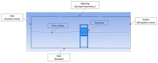 Figure 3 shows a schematic view of the boundary conditions. On the left hand side is the inlet boundary allowing the input of incident waves. In the numerical analysis, a piston-type wave maker method was applied to produce incident waves []. The seabed is impermeable condition for fluid like a wall while a free surface between the water and air was applied at the interlayer. The open area is on the top boundary for the air except for the air in the chamber that is confined depending on the variation of the chamber-geometry. At the right hand side it is an outlet boundary allowing the dissipation of the waves propagating away. For the side-condition of analytical domain a symmetrical condition is presumed. The symmetry conditions is not like a wall boundary condition, which is a “non-slip” condition in which it assumes the velocity at the wall is zero no matter what wall roughness value is applied. While the “slip” boundary (slip/symmetry boundary) would allow the flow to move along the boundary, it means that the velocity at the slip/symmetry boundary is not zero.
